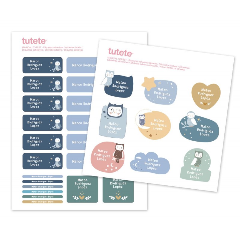 29 etiquetas adhesivas personalizadas de la Colección Vuelta al Cole 2025 Magical Forest de Tutete con el que podrás etiquetar libros, fiambreras, juguetes, botellas...