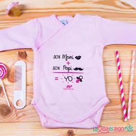 Con este body cruzado de color azul de manga larga diseñado con mucho mimo, el bebé lo dice muy claro: "50% Mami + 50% Papi = YO". El body va presentado en una cajita blanca acompañada de una pegatina y una tarjetita de diseño Lavidaesalgomas.