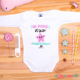 Talla: 1 mes Este body tan gracioso está diseñado con mucho amor dedicado a esos super papis tan guays. Y el bebito, nacida en pleno siglo XXI, expresa claramente lo que quiere a su papá con la moda actual de los hashtag: "#lequieroconlocura" El body va presentado en una cajita blanca acompañada de una pegatina y una tarjetita de diseño Lavidaesalgomas.