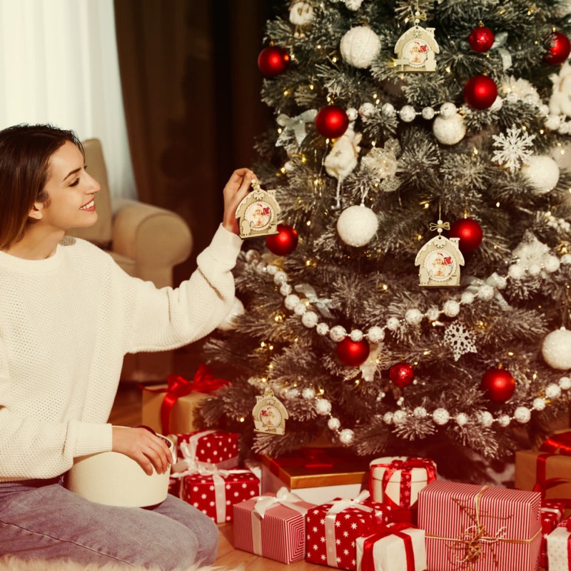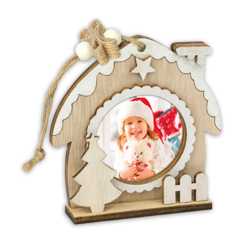 Adorno Colgante de Navidad de Madera Personalizable con diseño de Casa navideña nevada de color natural modelo estrella con adornos de valla y árbol de Navidad perfecto para decorar y llenar de magia e ilusión el Árbol de Navidad estas Navidades. Este Adorno de Navidad con Foto incluye una cuerda para colgar fácilmente en el árbol. Se puede personalizar con una foto.