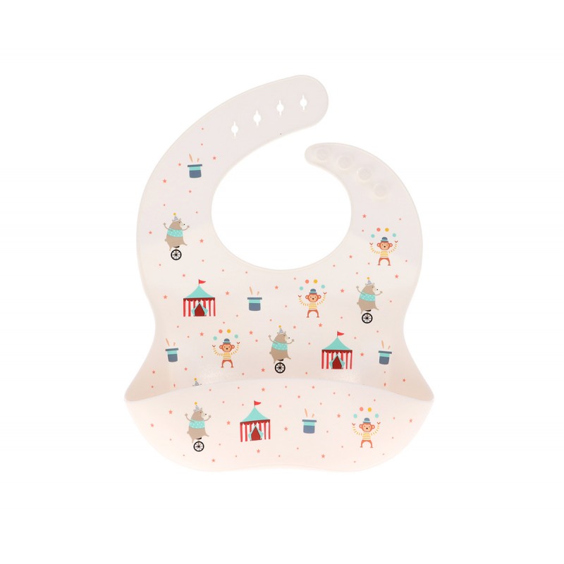 Precioso, original y práctico babero de silicona con diseño Circus. Cuenta con un bolsillo recogemigas, para evitar que caiga la comida a la ropa.