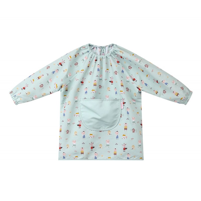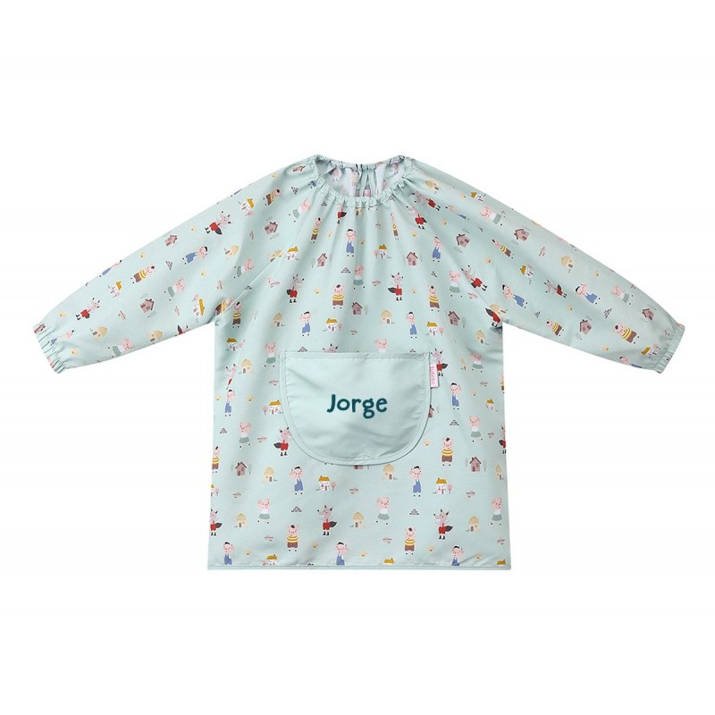 Babi Infantil Impermeable con bolsillo central personalizable divertido y funcional de la Colección Vuelta al Cole 2025 The Three Little Pigs de Tutete, inspirado en el cuento clásico de los 3 cerditos, perfecto para que los peques vayan perfectamente uniformados a la Escuela Infantil, Guardería o colegio con la comodidad de llevar un babi sin botones.