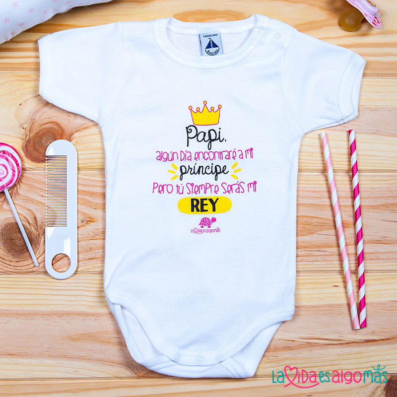 Hemos diseñado este body blanco de manga corta abierto al hombro "Papi, algún día encontraré a mi príncipe pero tú siempre serás mi rey" con todo nuestro cariño para todas las niñas que adoran a su papá.