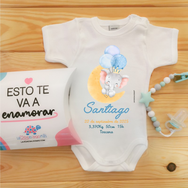 Body Personalizado abierto al hombro de manga corta con los Datos de Nacimiento con Diseño de Elefantito "Mi Primer Body" con tonos azules de Lavidaesalgomas®, ideal para tener un recuerdo para siempre de los Datos del Nacimiento del bebé.