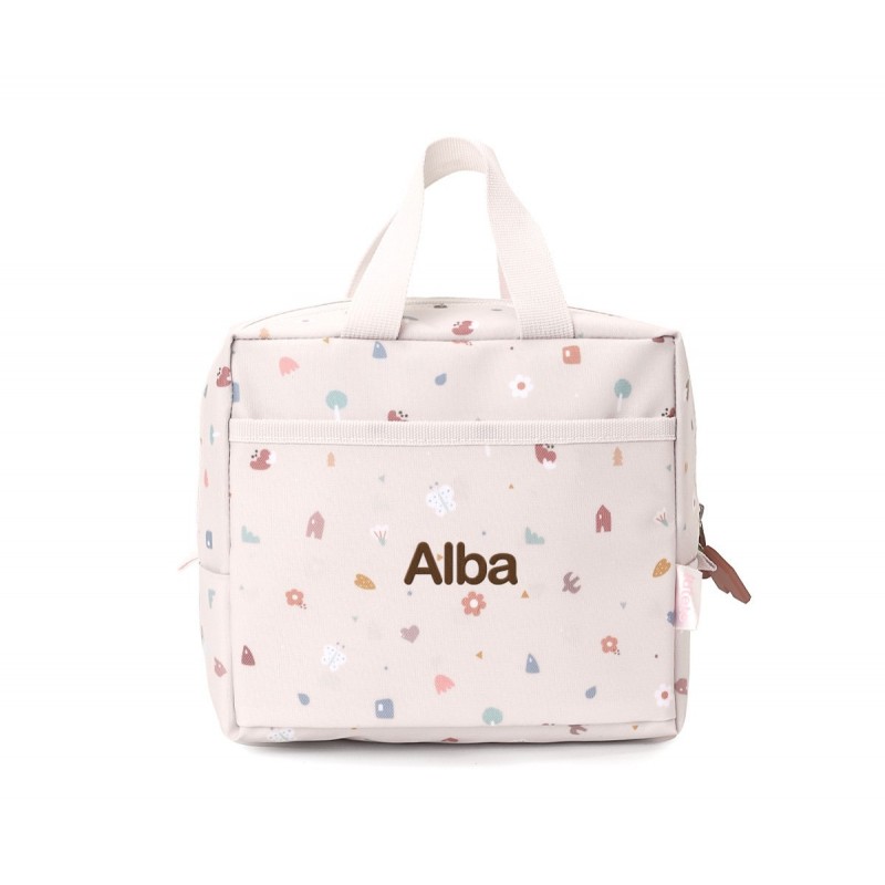 Tiene 2 asas cortas, para fácil transporte, y un bolsillito exterior donde puedes guardar cubiertos o pequeños objetos que necesites tener más a mano, que lo puedes personalizar con el Nombre del peque.