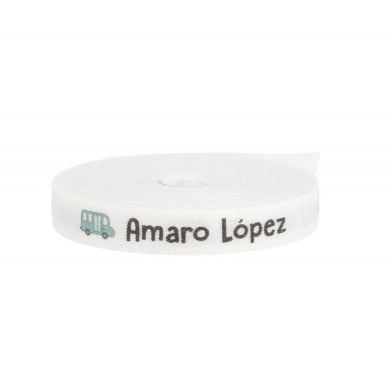 Rollo de Cinta marca prendas de tela termoadhesiva de 1 cm de ancho con el nombre de tu peque ya escrito y un dibujo decorativo de Autobús personalizada de la Colección City Cars con las podrás identificar la ropita de tu hijo, es perfecto para el cole, guardería y las clases de deporte...