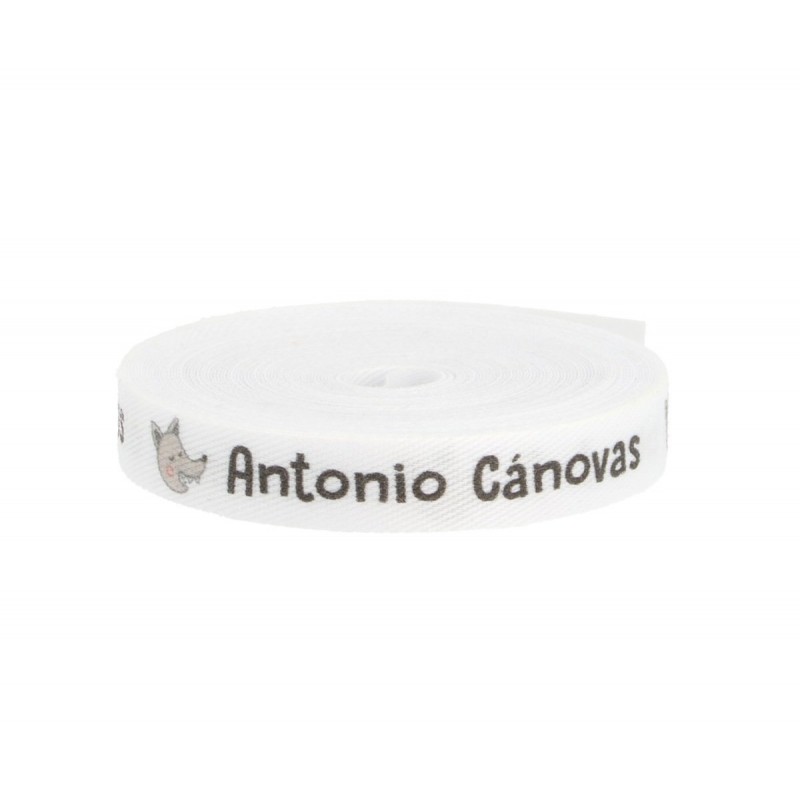 Rollo de Cinta marca prendas de tela termoadhesiva de 1 cm de ancho con el nombre de tu peque ya escrito y un dibujo decorativo del Lobo Feroz de Caperucita Roja personalizada de la Colección Little Red con las podrás identificar la ropita de tu hijo, es perfecto para el cole, guardería y las clases de deporte...
