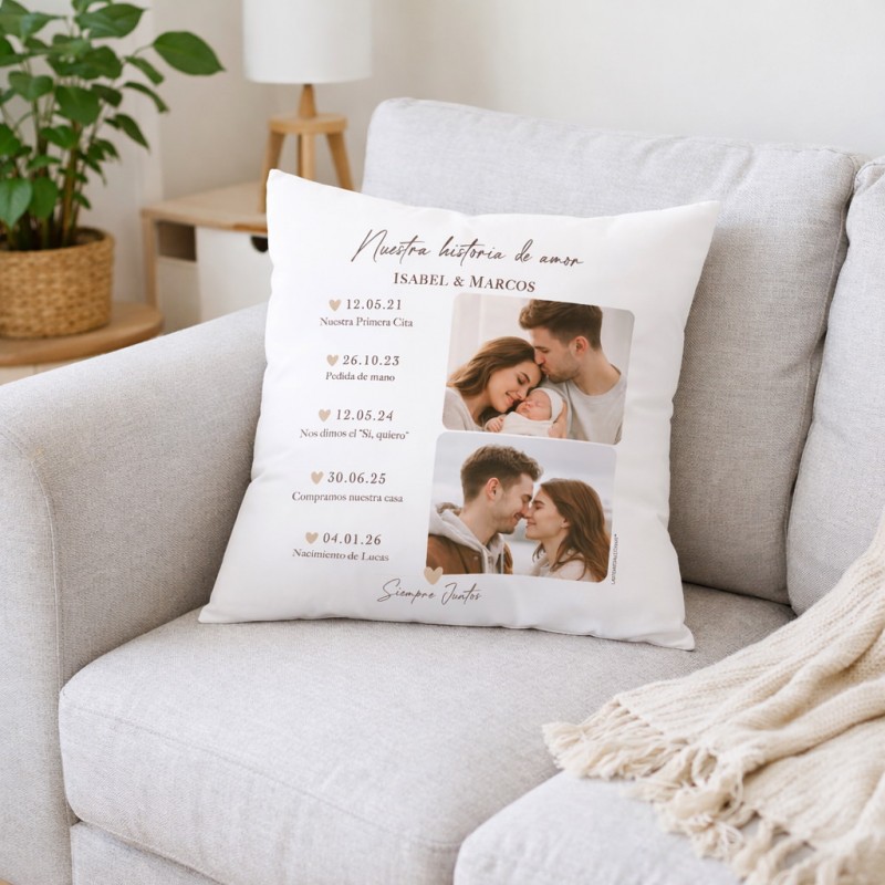 Cada cojín personalizado de parejas se personaliza con las fechas de los acontecimientos que ha vivido la pareja (hasta un máximo de 10 acontecimientos) y 2 fotos de vuestros momentos más importantes , por lo que es única, como vuestra historia de amor :)
