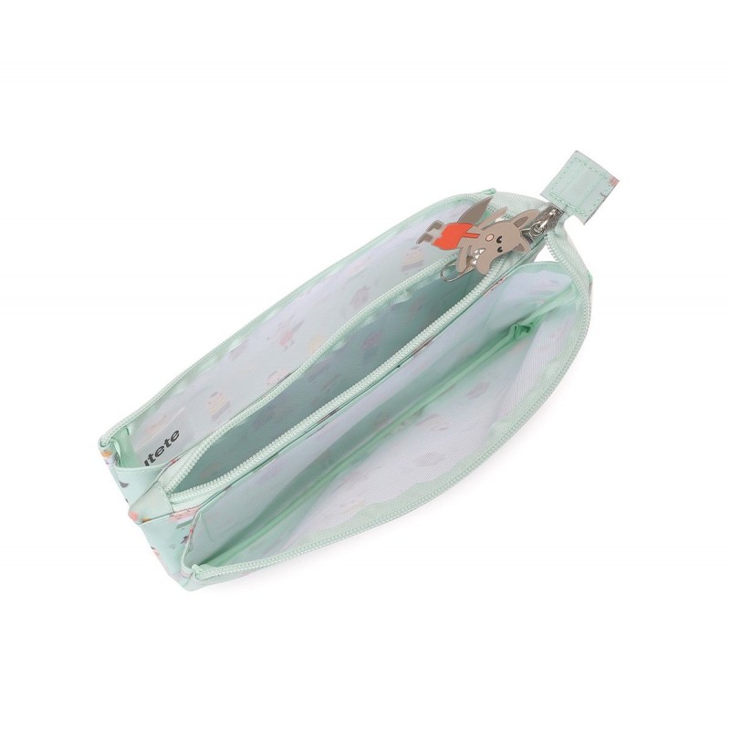 Gracias a su cremallera principal, el estuche se abre para revelar tres compartimentos bien distribuidos que facilitan la organización por tipos de material. El compartimento central también cuenta con su propia cremallera. Además, incluye un tirador decorativo de silicona con forma temática, que lo hace aún más especial y fácil de usar por los más pequeños.