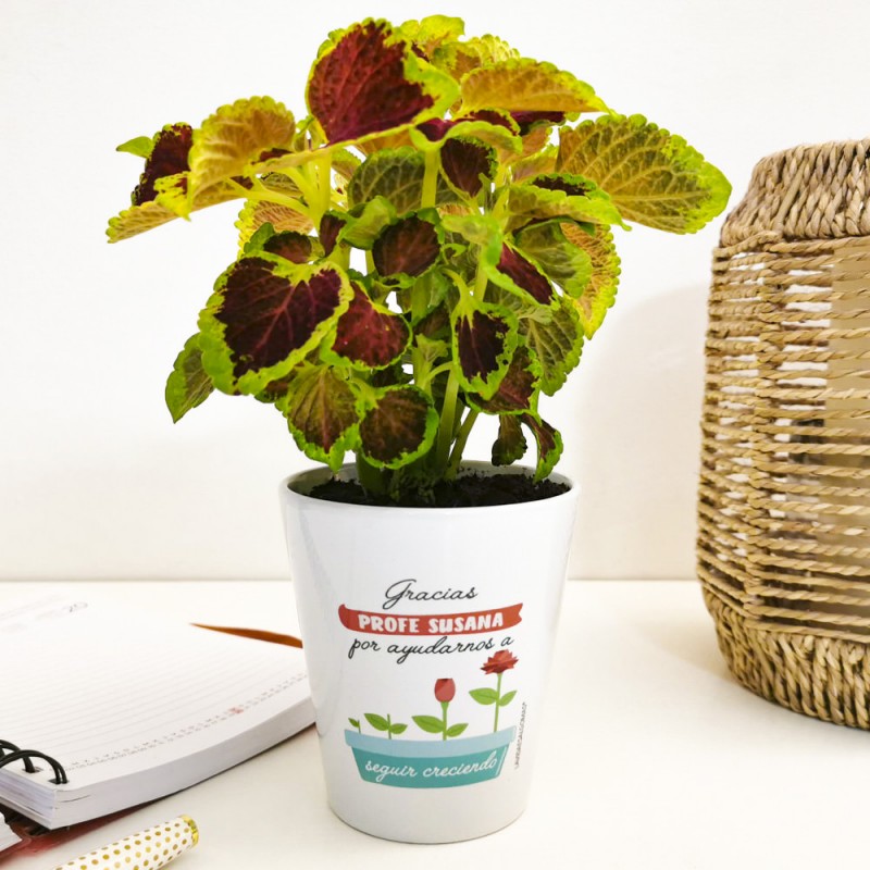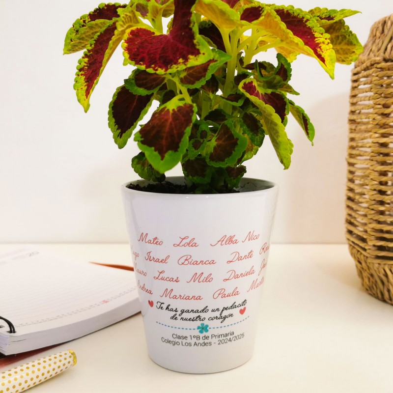 Esta Maceta personalizada se puede personalizar el nombre del profe, Clase, Curso, Colegio, año escolar y nombres de los alumnos en la cara posterior así como la posibilidad de modificar la dedicatoria estándar e incluir una dedicatoria personalizada por 2€.
