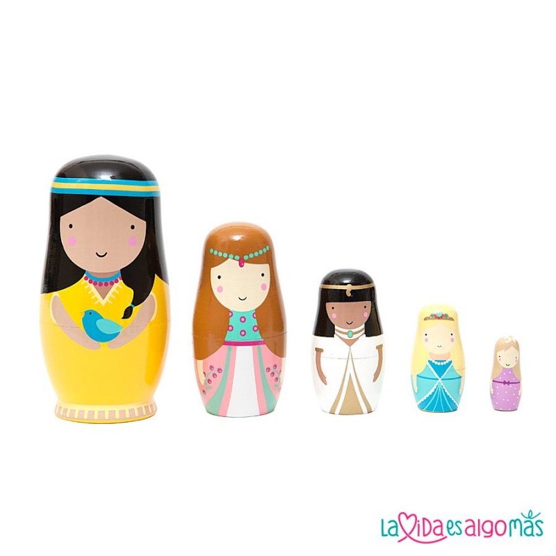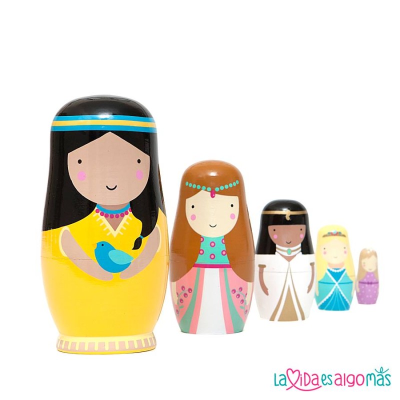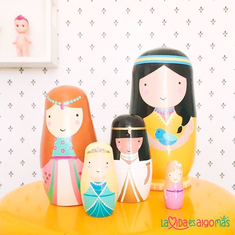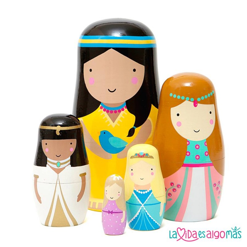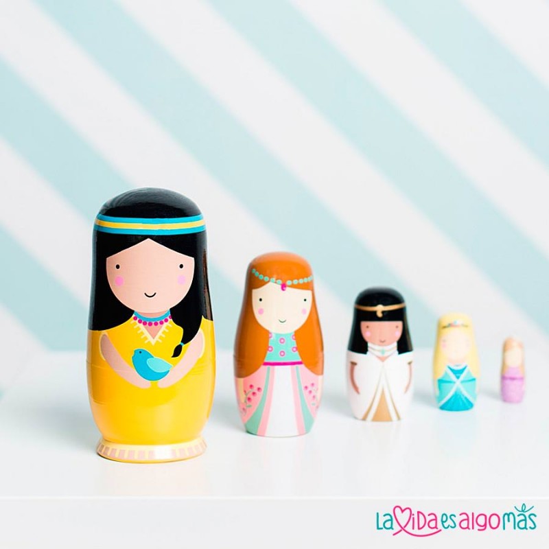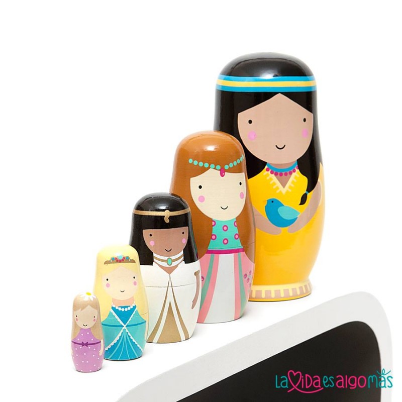 Las muñecas matrioskas tradicionales, las de toda la vida, ¡pero mucho más bonitas! Conjunto de 5 Matrioskas de madera con diseños de princesas de estilo nórdico que han sido elaboradas y pintadas a mano haciendo cada pieza única y especial.
