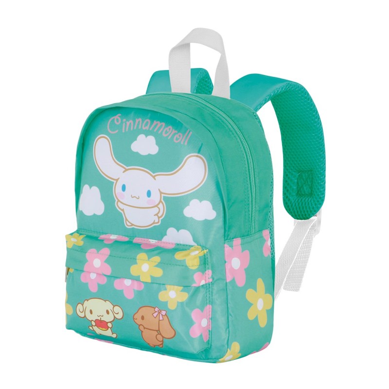 Decorada con el adorable personaje Cinnamoroll y flores coloridas, esta mochila es perfecta para fans de la marca Sanrio.
