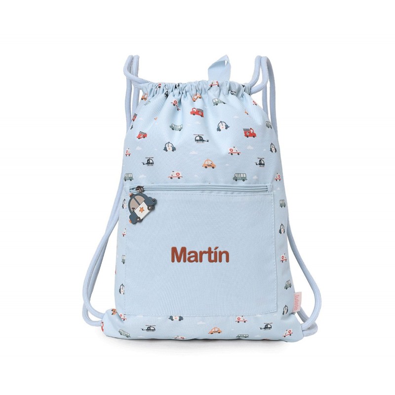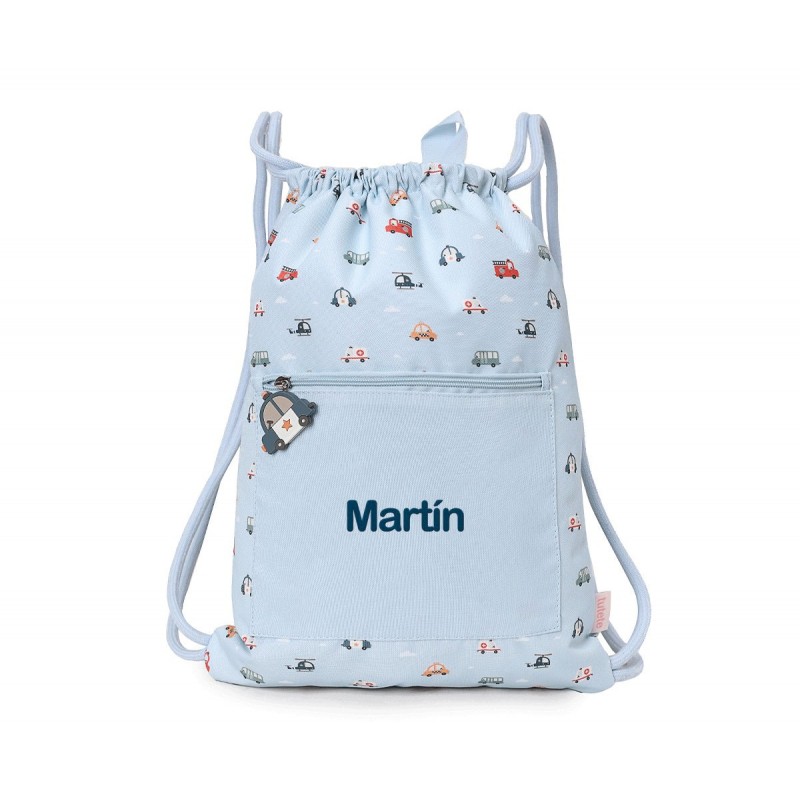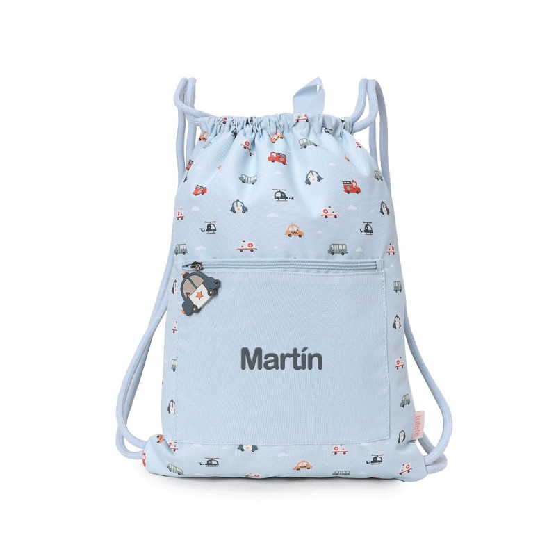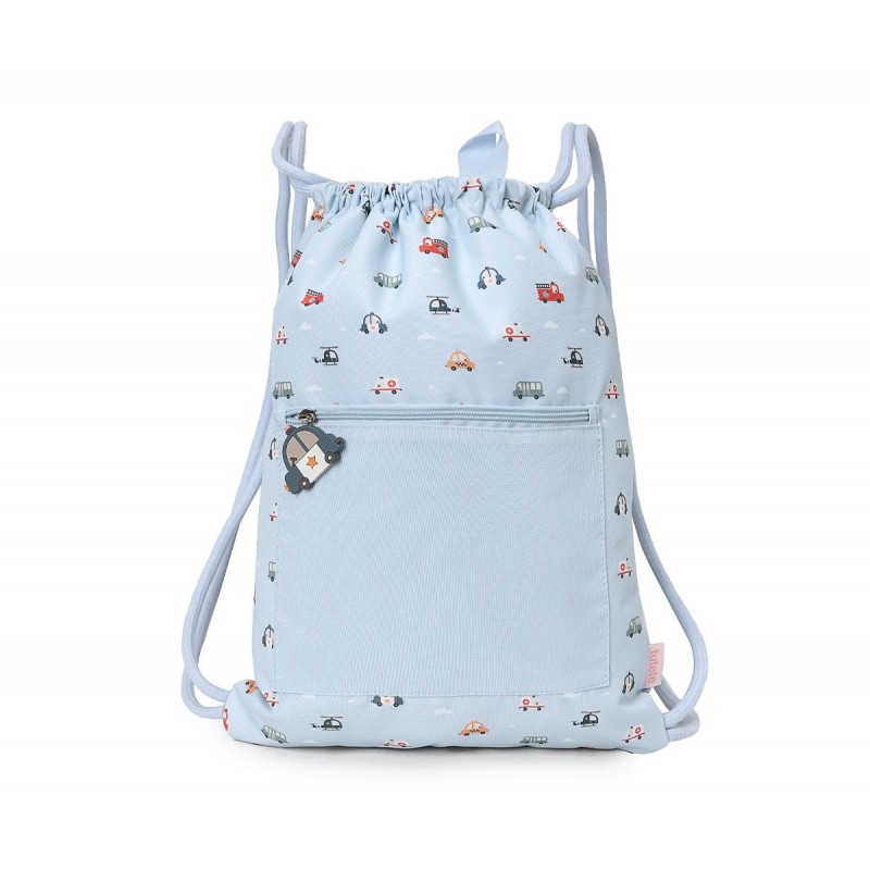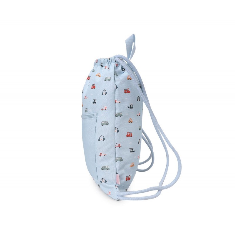 Mochila de cuerdas saco impermeable Personalizable de la Colección Vuelta al cole tutete 2025 City Cars, con diseño de vehículos de la ciudad como ambulancias, taxis... dispone de cuerdas para colgar en la espalda.