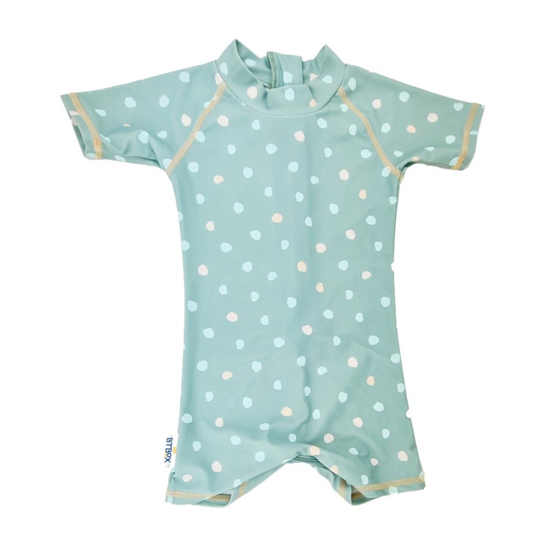 Mono con Protección Solar UPF50+ para bebés de la colección "Lunares Sage" de Btbox disponible en Manga Corta. Se trata de un Traje Solar UPF50+ de una pieza para bebés que dispone de dos cremalleras. Una crema en cuerpo para poner y quitar fácilmente y una cremallegar en entrepierna para facilitar el cambio de pañal.