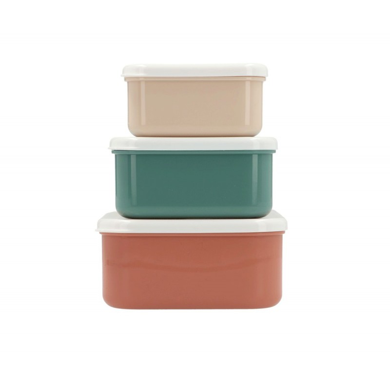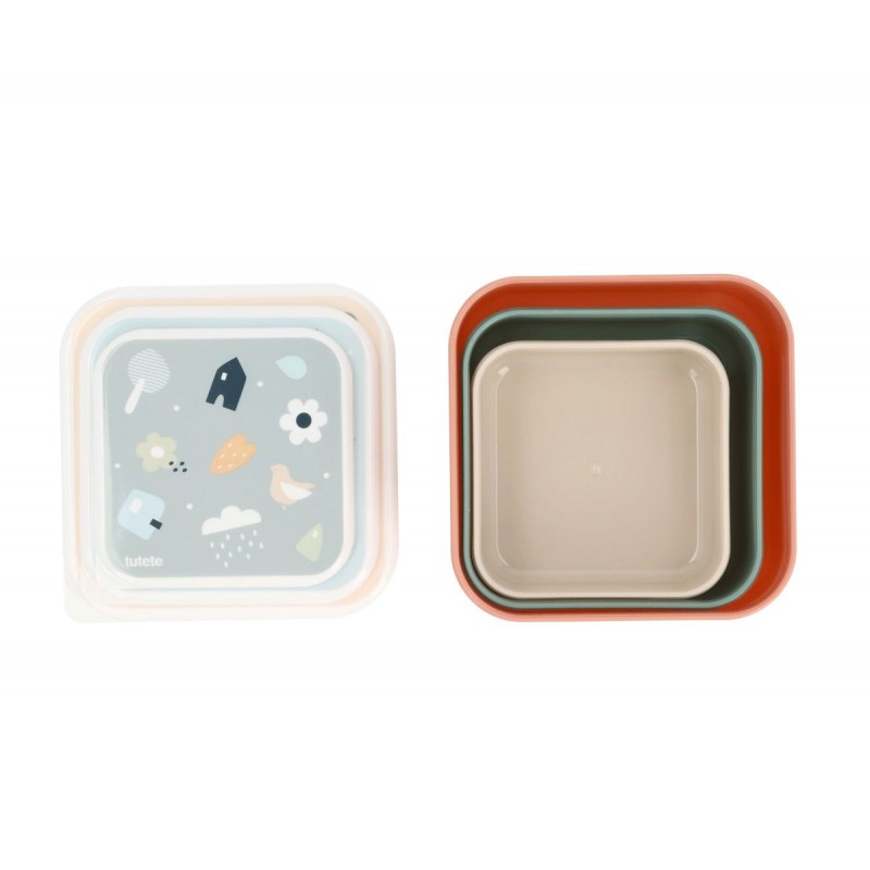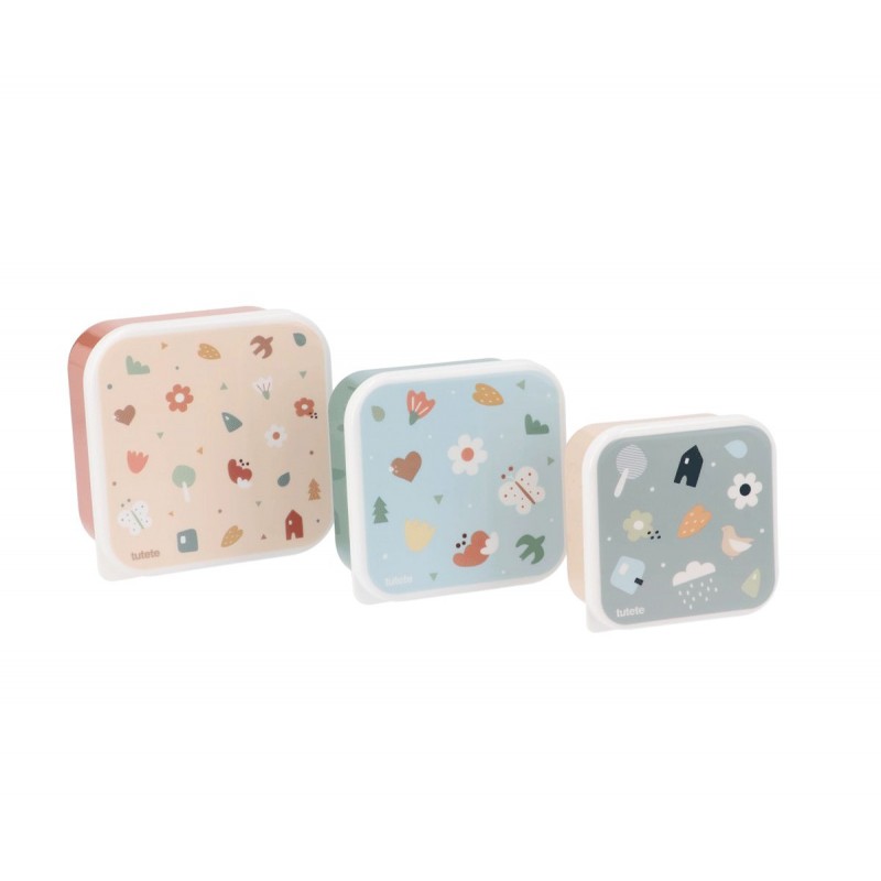 Precioso Pack de 3 Cajitas Almuerzo de la Colección de Vuelta al cole de Tutete Geometric Nature 25 con diseño de flores, plantas y animalitos de la naturaleza..., ideal para llevar el almuerzo al cole, al parque, de excursión....