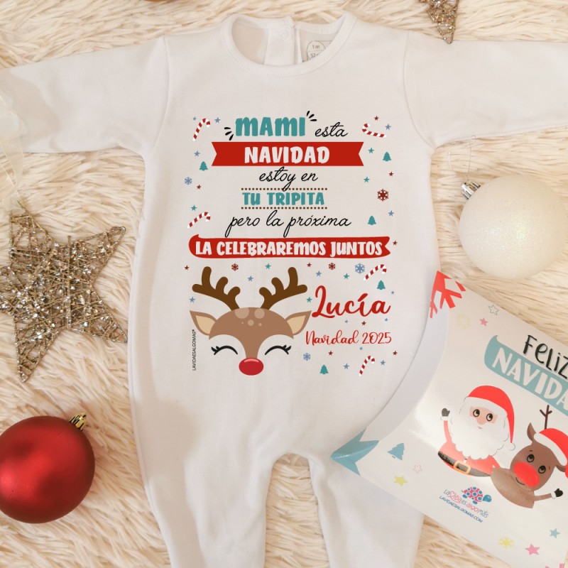 Pijama personalizado manga larga "MAMI, NAVIDAD EN LA TRIPITA" + CAJA REGALO con diseño de Navidad Lavidaesalgomas®, ideal para que el bebé sorprenda a papá de una manera preciosa en Navidad.