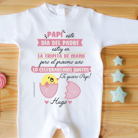 Pijama personalizado de manga larga "Día del padre en la tripitade mamá" con diseño en color Rosa de Lavidaesalgomas®, ideal para que el bebé sorprenda a papá de una manera preciosa en su primer día del padre desde la tripita de mamá :)