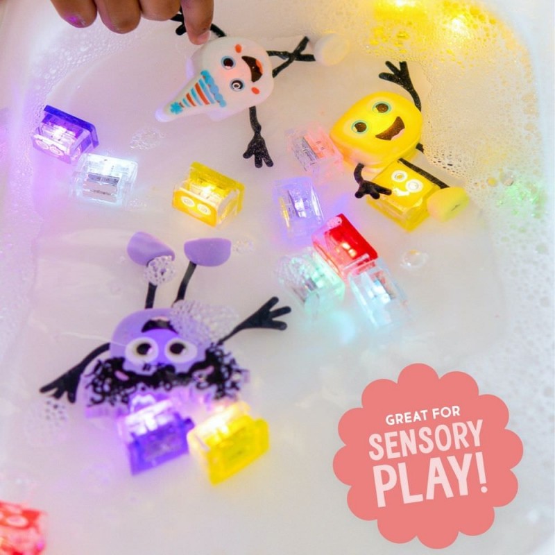 Combina tus cubos Glo Pals con otros cubos de diferentes colores y convierte la bañera en una fiesta de color luminoso. Los peques se divertirán en grande.