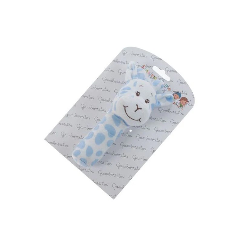 Suave Sonajero Jirafa personalizable de color azul muy fácil de coger por las manos de tu bebé con tacto aterciopelado. Suena al apretarlo con las manos.