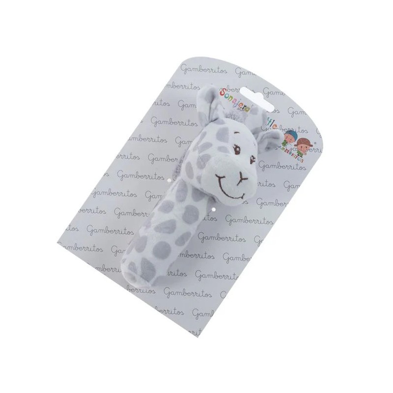 Suave Sonajero Jirafa personalizable de color gris muy fácil de coger por las manos de tu bebé con tacto aterciopelado. Suena al apretarlo con las manos.