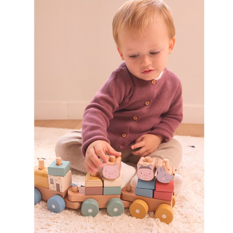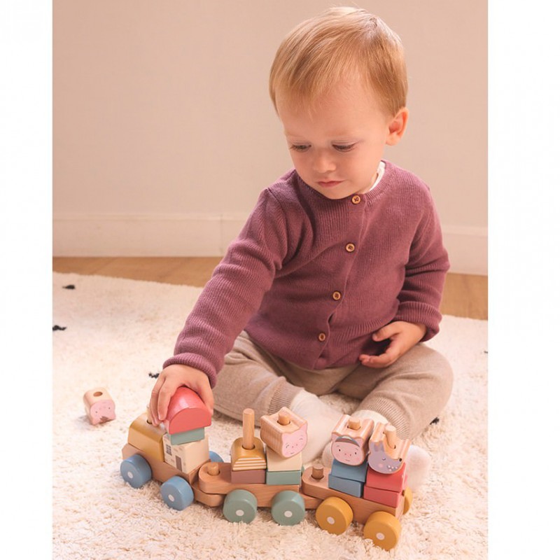 Este Tren Personalizado Little Pigs Family con Datos Natalicios, está compuesto por 1 locomotora, 2 vagones y 16 bloques apilables en colores suaves con las formas de los 3 cerditos y el lobo feroz. Por ejemplo, es ideal para decorar la habitación del bebé o para colocar en el rincón más especial de la casa.
